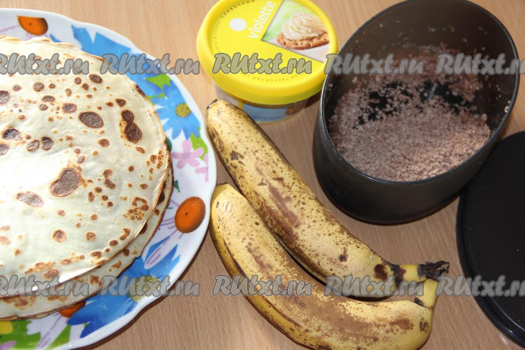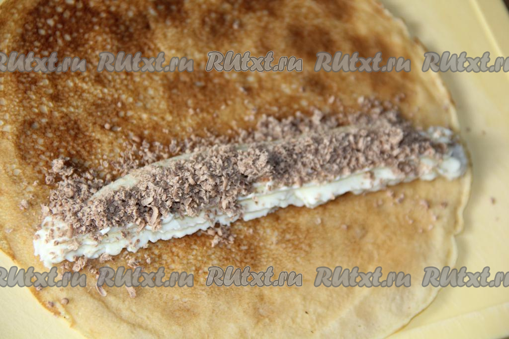 Готовые блинчики остудить. Творожный сыр предварительно достать из холодильника. Шоколад натереть на мелкой тёрке.