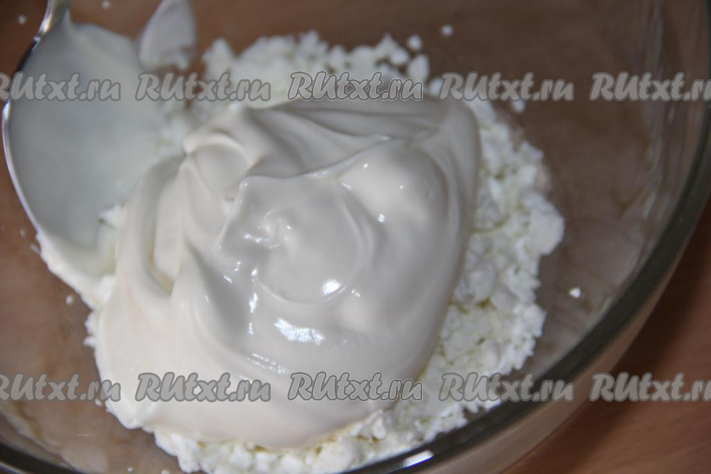 Бананы очистить, поломать на кусочки и добавить в миску к творогу и сметане. Всыпать сахар (я не использовала сахар, так как готовила десерт для ребенка).