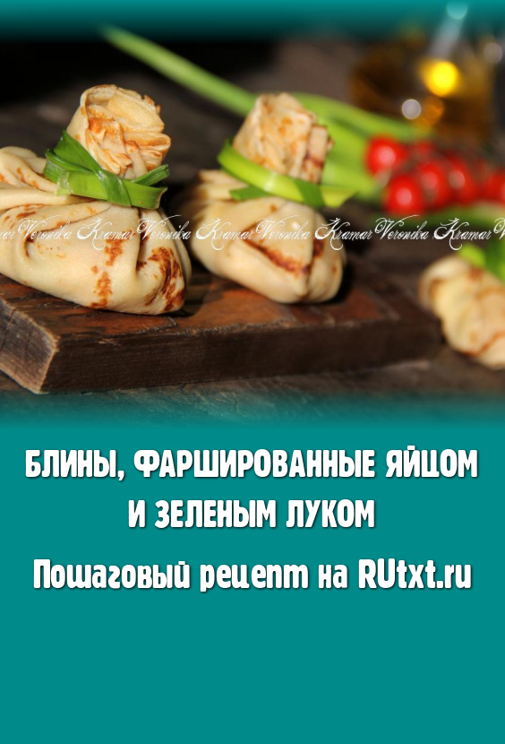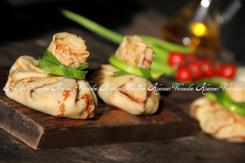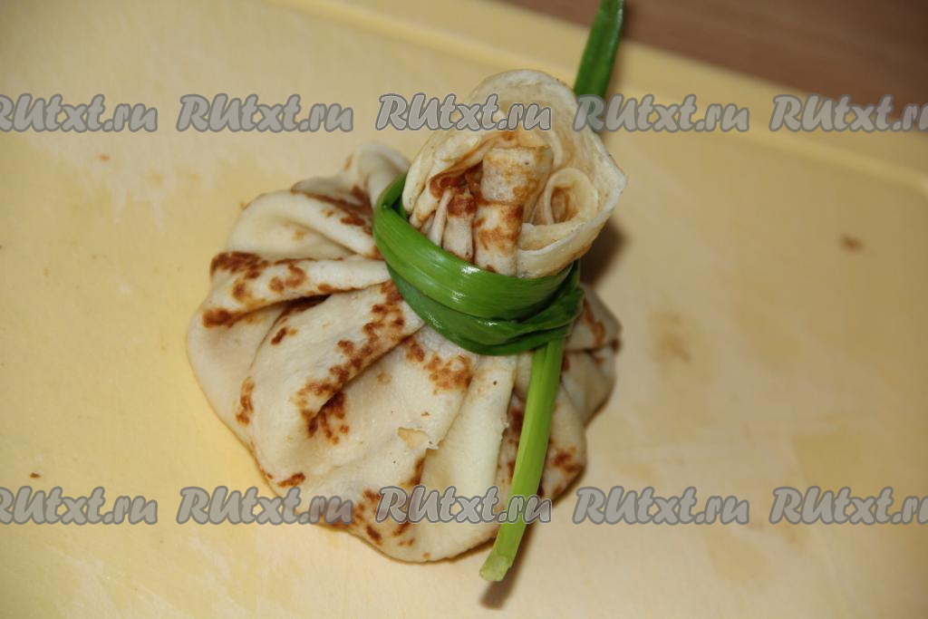 Завернуть начинку в блин любым способом. Я сделала мешочки (как на фото) и перевязала перьями лука. У меня получилось 8 блинных мешочков (блинчики ещё остались).