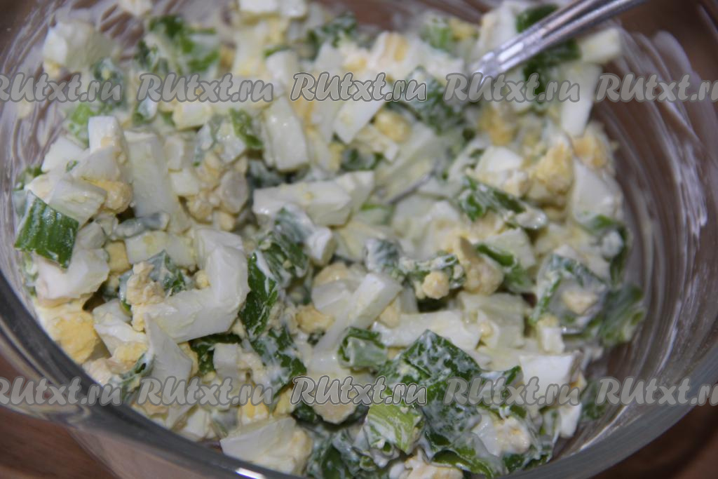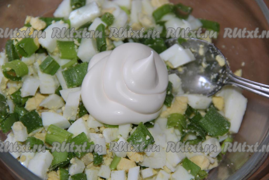 Соединить яйца, зеленый лук, соль и майонез.