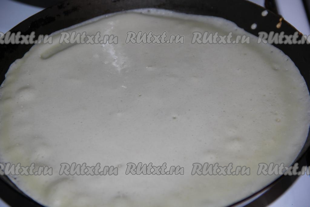 Выпекать блинчики на раскалённой сковороде на среднем огне. Я смазывала сковороду маслом только перед первым блином. Налить на сковороду немного теста, равномерно распределить.