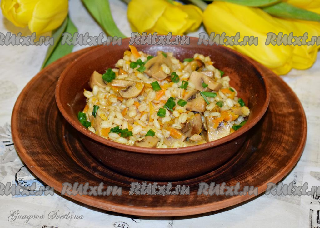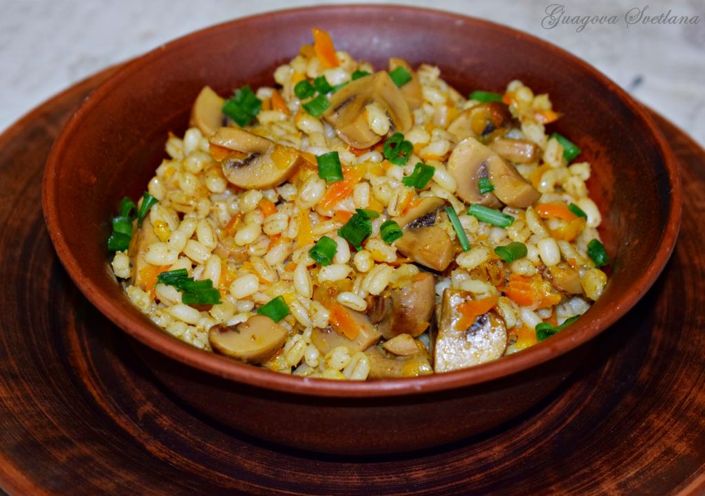 Наша перловка с шампиньонами, луком и морковью будет готова, когда вода полностью впитается, а крупинки станут мягкими и рассыпчатыми.