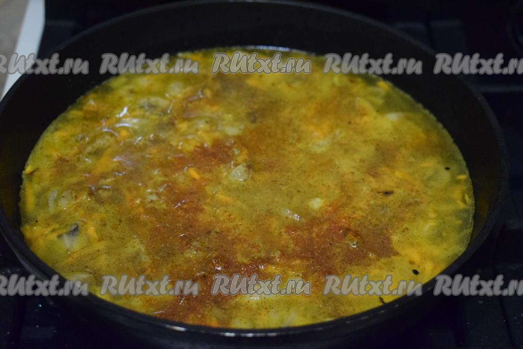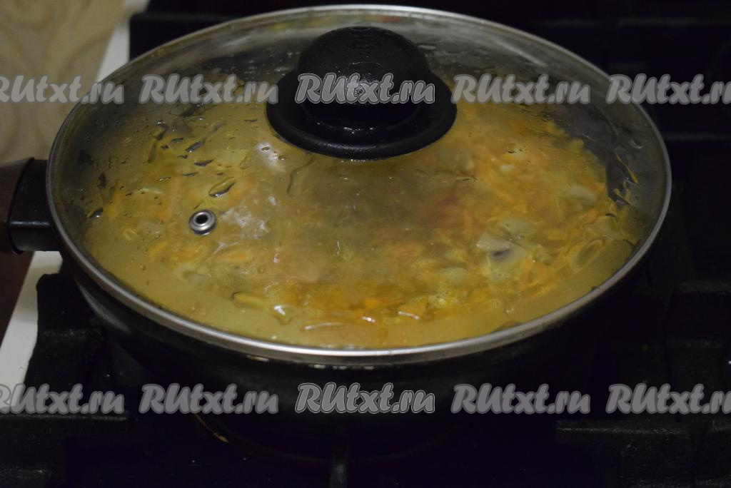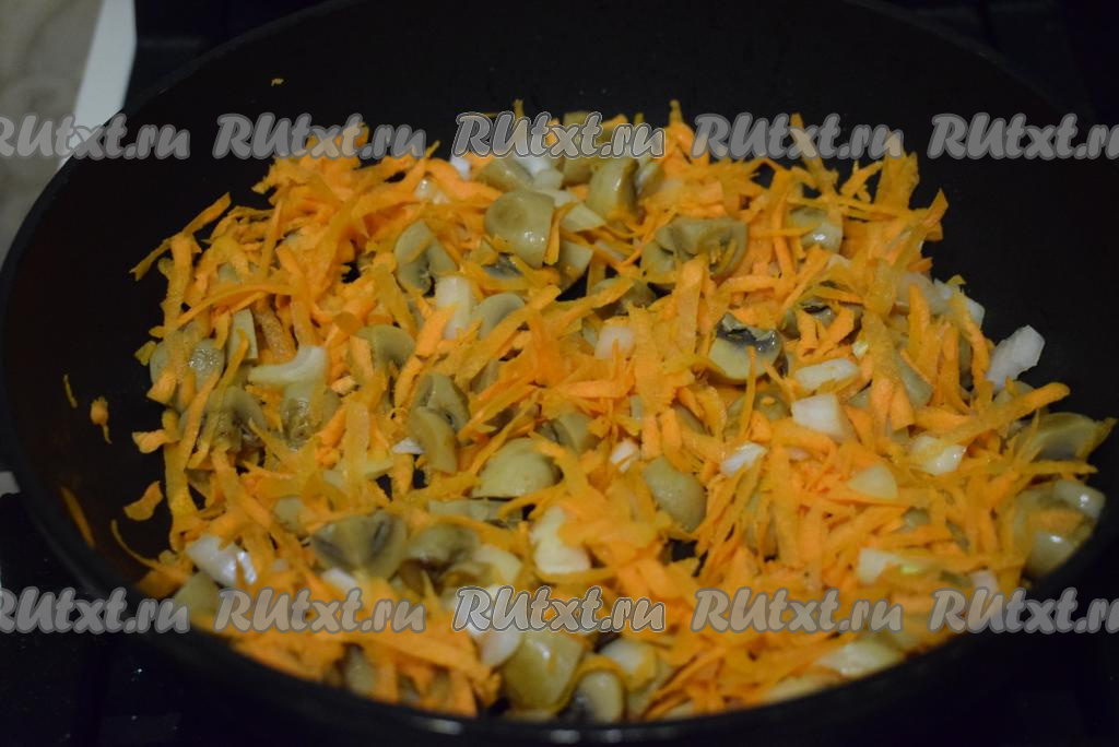 К слегка обжаренным шампиньонам добавляем измельченные лук и морковь, тушим, накрыв сковороду крышкой, до готовности овощей на небольшом огне (примерно, 15 минут), иногда перемешивая.