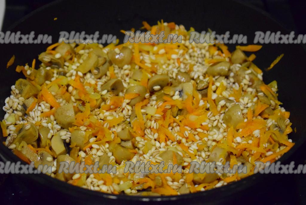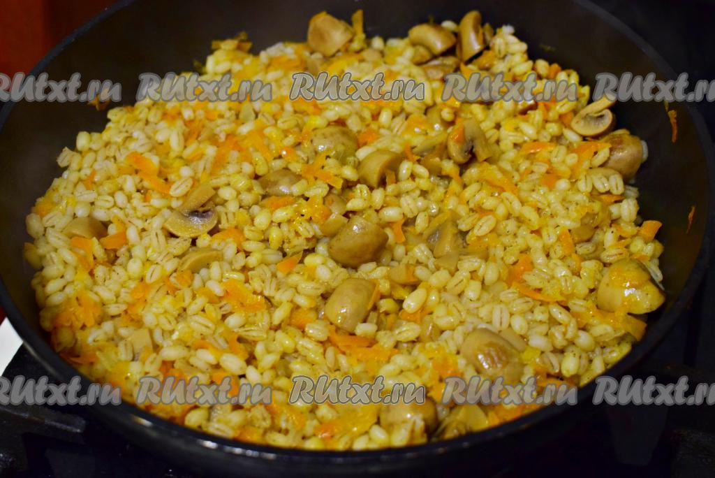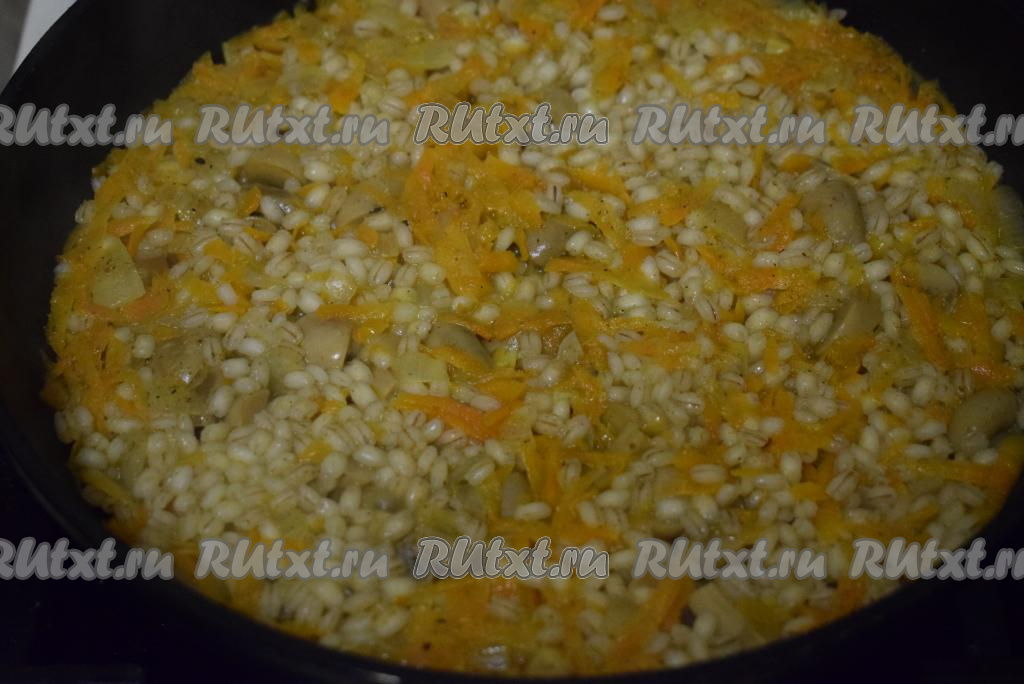 С перловой крупы сливаем воду, в которой перловка замачивалась. В сковороду к тушеным овощам и шампиньонам выкладываем разбухшую перловую крупу.