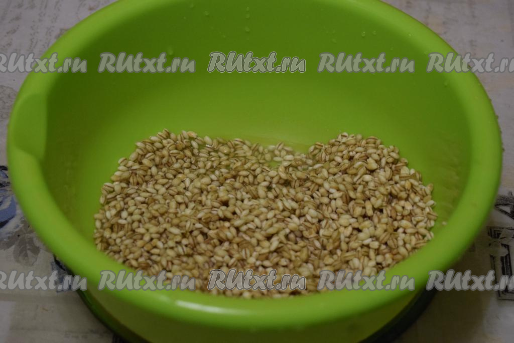 Для начала подготовим перловую крупу. Для того чтобы наше блюдо получилось вкусным и рассыпчатым, предварительно промоем крупу до прозрачности воды, далее замочим ее в кипятке (на 1 стакан перловки 3 стакана кипятка) и оставим набухать на 2-3 часа.