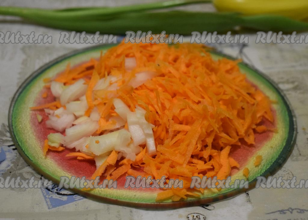 Пока крупа набухает, подготовим овощи. Морковь и репчатый лук очистим. Луковицу нарежем на мелкие кубики, морковь натрем на крупной терке.