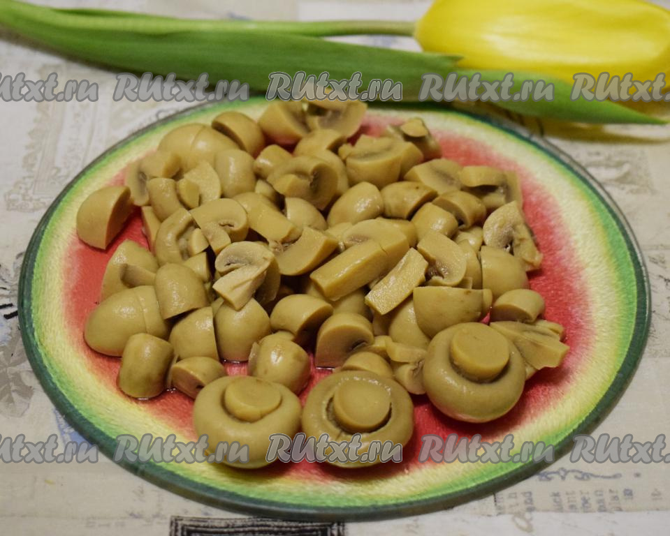 Шампиньоны промоем, очистим от кожицы и нарежем на крупные дольки. Для этого блюда можно брать не только свежие грибы, но и отварные консервированные шампиньоны (они не маринованные, практически пресные, и похожи по вкусу на свежие шампиньоны), как, например, сделала я.
