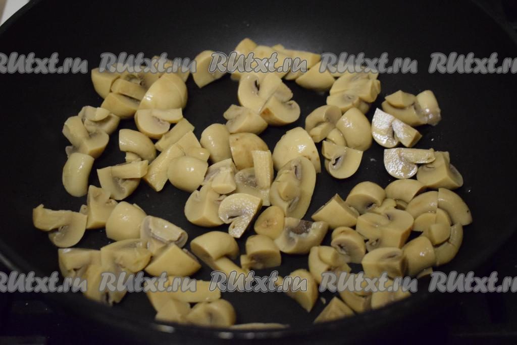 Далее обжариваем шампиньоны на растительном масле на среднем огне до выпаривания жидкости, примерно, 2-3 минуты.