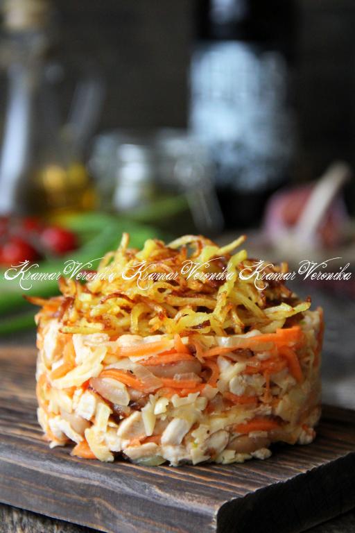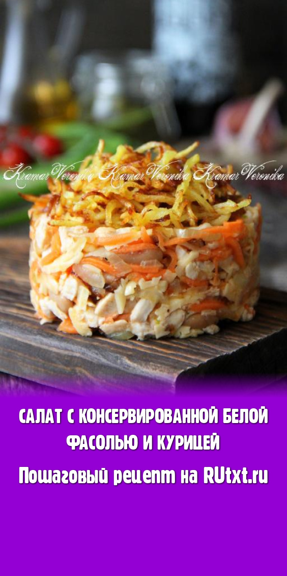 Поверх салатика пышной горкой выложите жареный картофель. Салат с консервированной белой фасолью и курицей получается сытным, вкусным, а при порционной подаче и красивым, и очень аппетитным.
