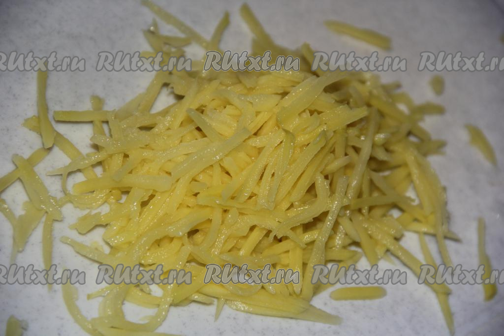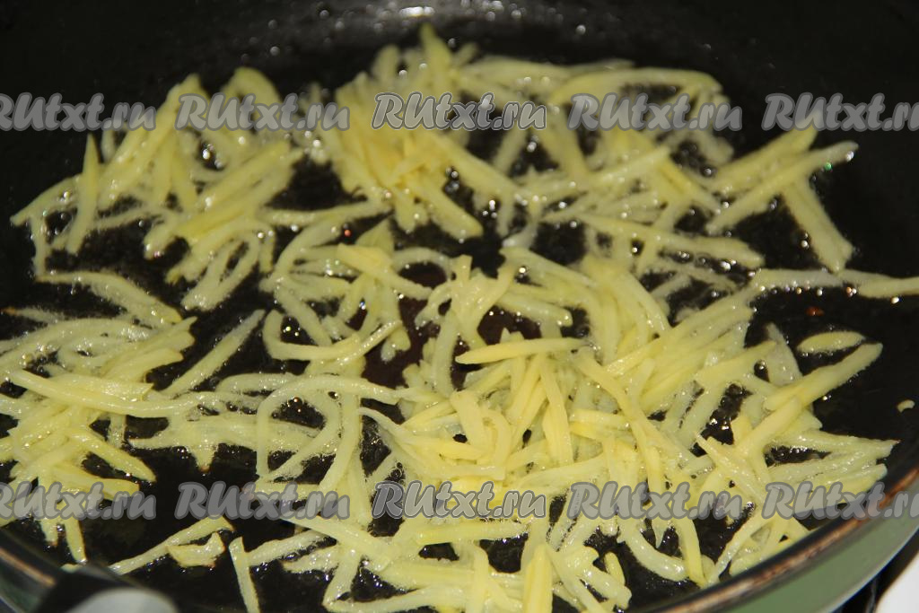 Картофель очистить и натереть на тёрке для моркови по-корейски (можно нарезать его на тонкие брусочки).