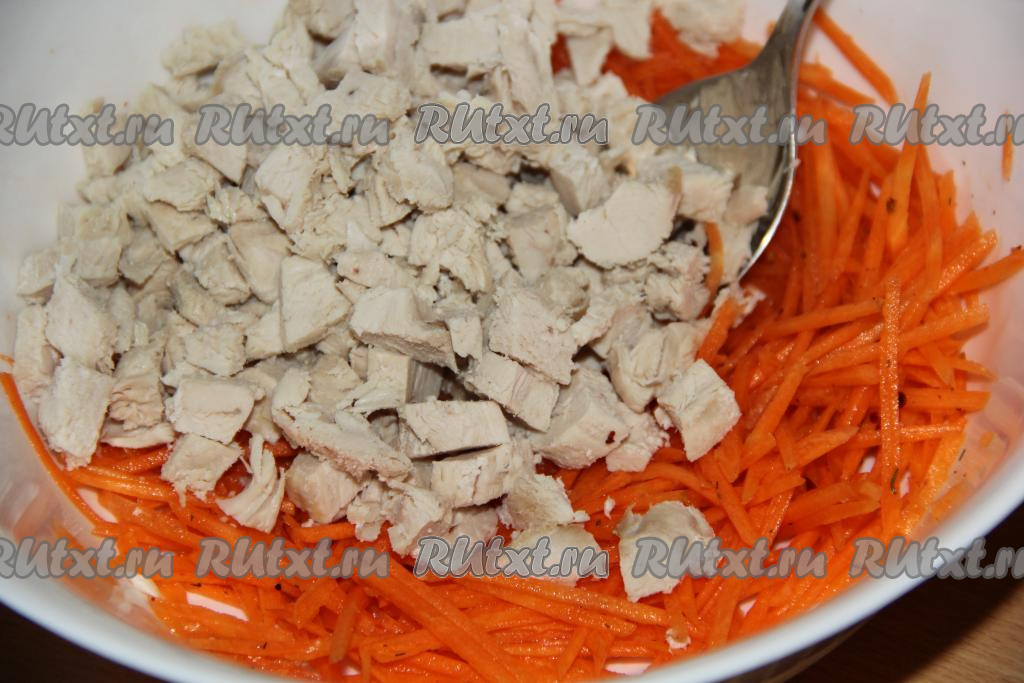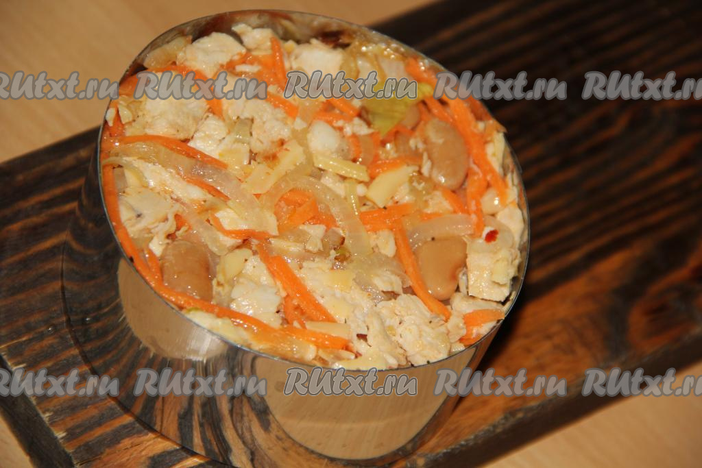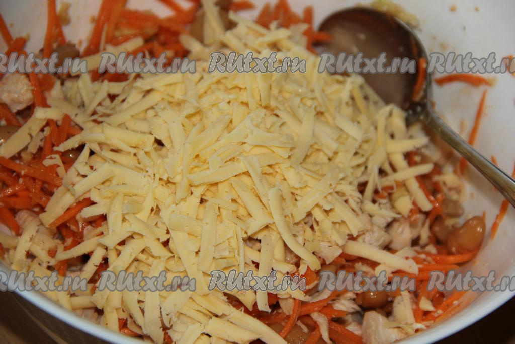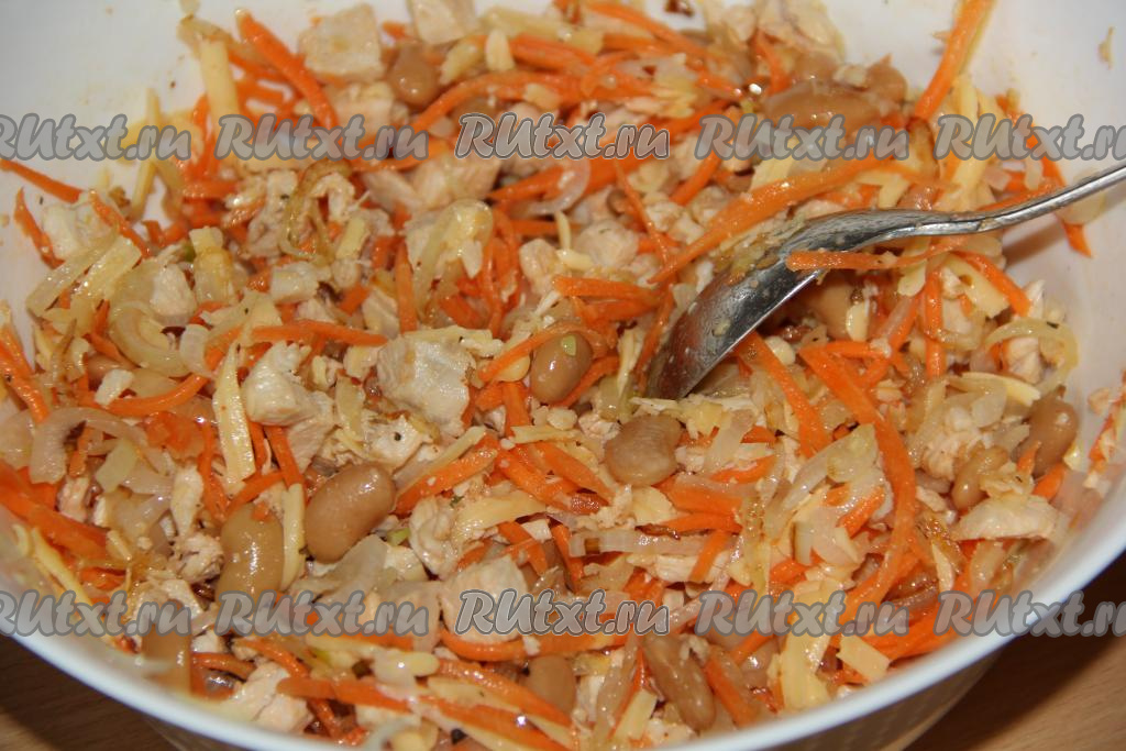 Затем к курице и моркови добавить консервированную белую фасоль (без жидкости) и пропущенный через пресс чеснок, перемешать салат.