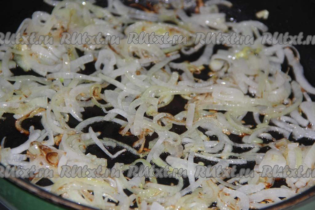 Лук для этого салата лучше нарезать тонкими полукольцами. Обжарить лук на растительном масле, иногда помешивая, до золотистого цвета, дать остыть.