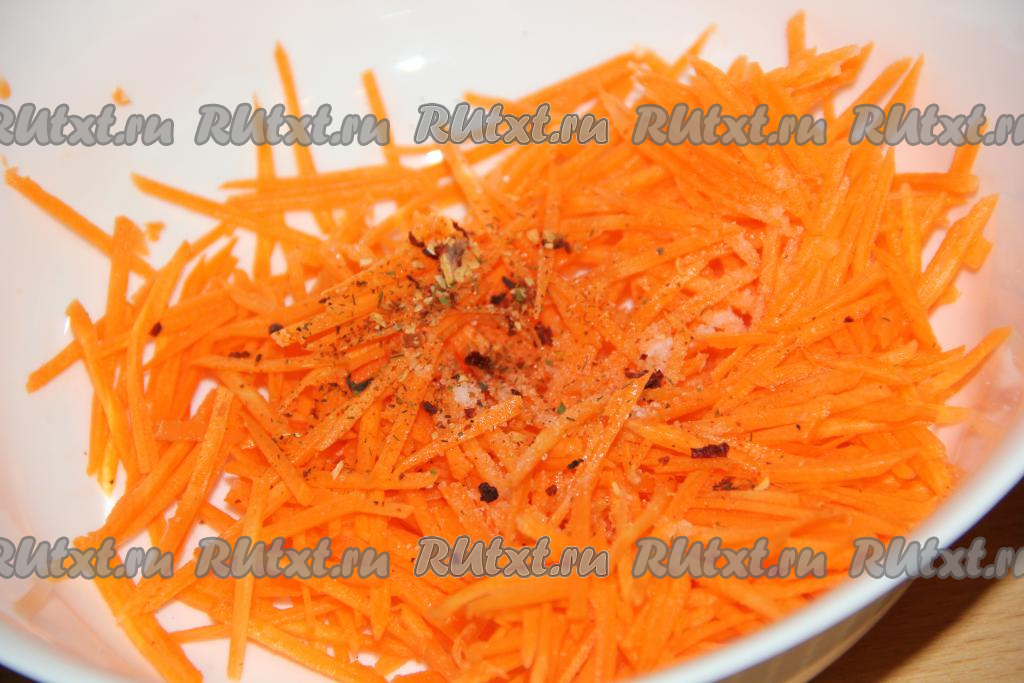 Очистить морковь и лук. Морковку натереть на тёрке для моркови по-корейски, посолить, поперчить (вместо чёрного молотого перца можно добавить любую приправку), перемешать и оставить на 10 минут.