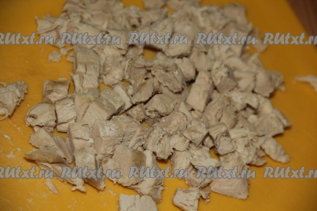 В подсоленной воде отварить куриную грудку до готовности (я отвариваю грудку в течение 20 минут). Остудить грудку в бульоне, а затем вынуть из бульона и нарезать на средние кубики.