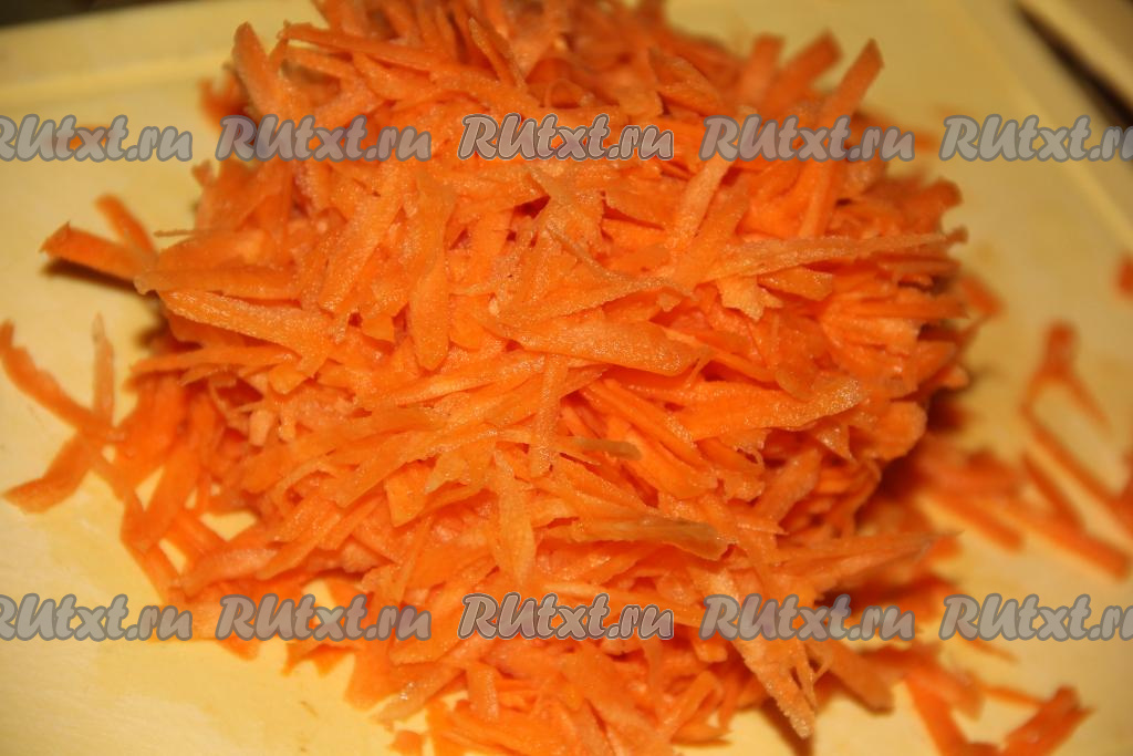 Затем к луку выложить натертую морковь и обжарить в течение 5-7 минут, периодически перемешивая.