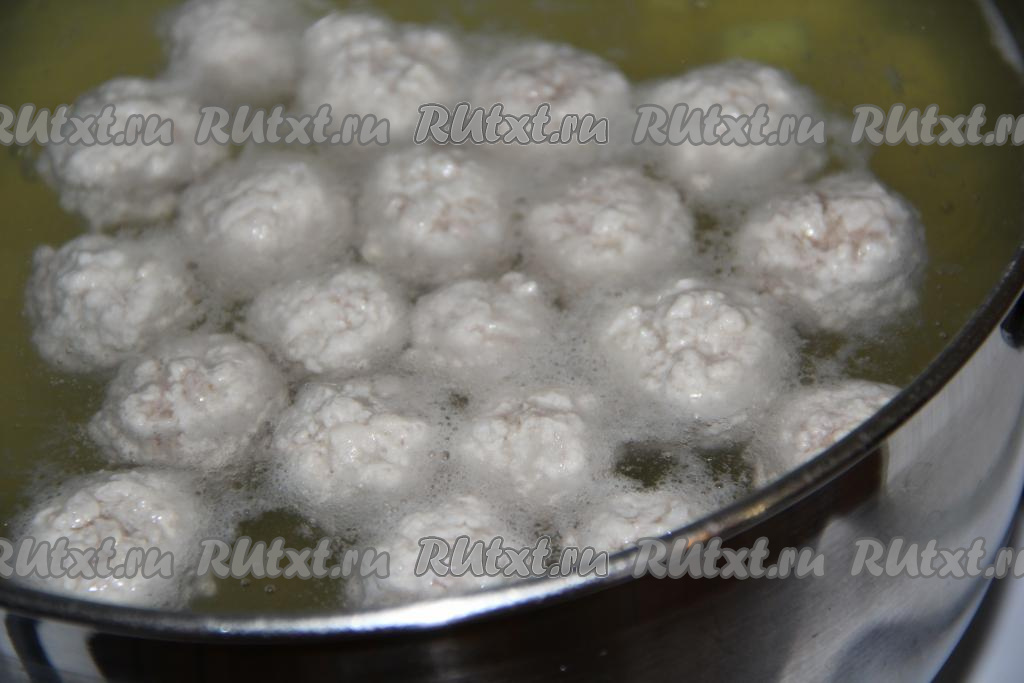 Из фарша сформировать круглые шарики (фрикадельки) размером с грецкий орех. Выложить фрикадельки и нарезанную картошку в кипящую воду, довести до кипения.