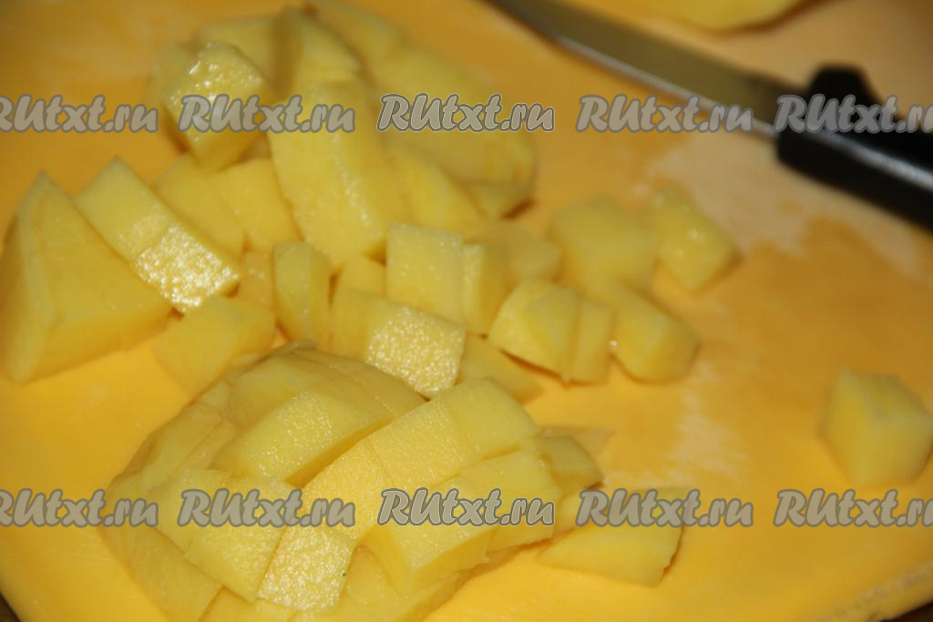 Лук, картошку и морковь очистить. В кастрюлю влить 2,3-2,5 литра воды и довести до кипения. Нарезать картофель на кубики.