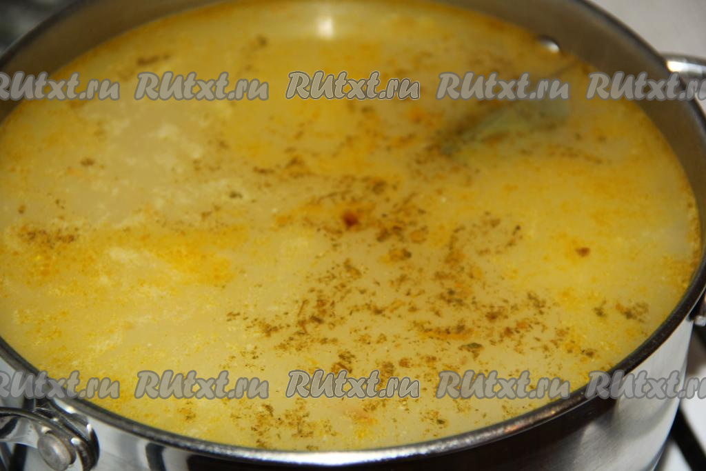 Добавить соль, специи и томить суп до полного растворения сыра, иногда помешивая (примерно, 5 минут), накрыть кастрюлю крышкой и снять с огня. Дать настояться минут 25.