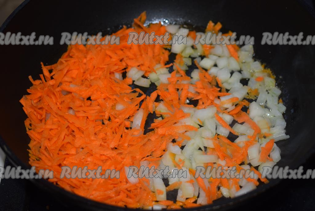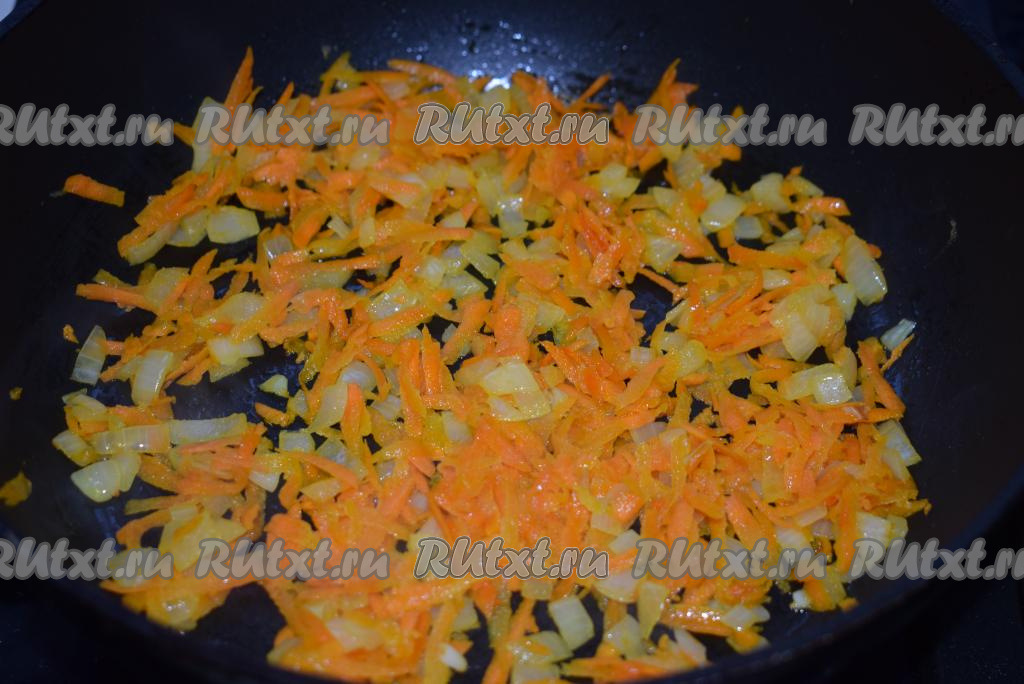 Пока варится бульон, приготовим овощную зажарку. Морковь и лук очистим. Нарежем лук мелкими кубиками, а морковь натрем на крупной терке, отправляем овощи в сковороду к растительному и сливочному маслу, обжариваем на медленном огне до прозрачности овощей, иногда помешивая.