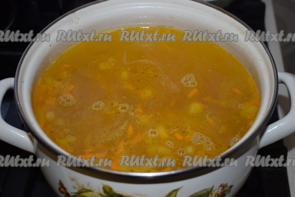 Добавляем в бульон картофель и доводим бульон до кипения на сильном огне. С момента закипания уменьшаем огонь и продолжаем варить картошку еще, примерно, 12 минут (до легкого разваривания картофеля).