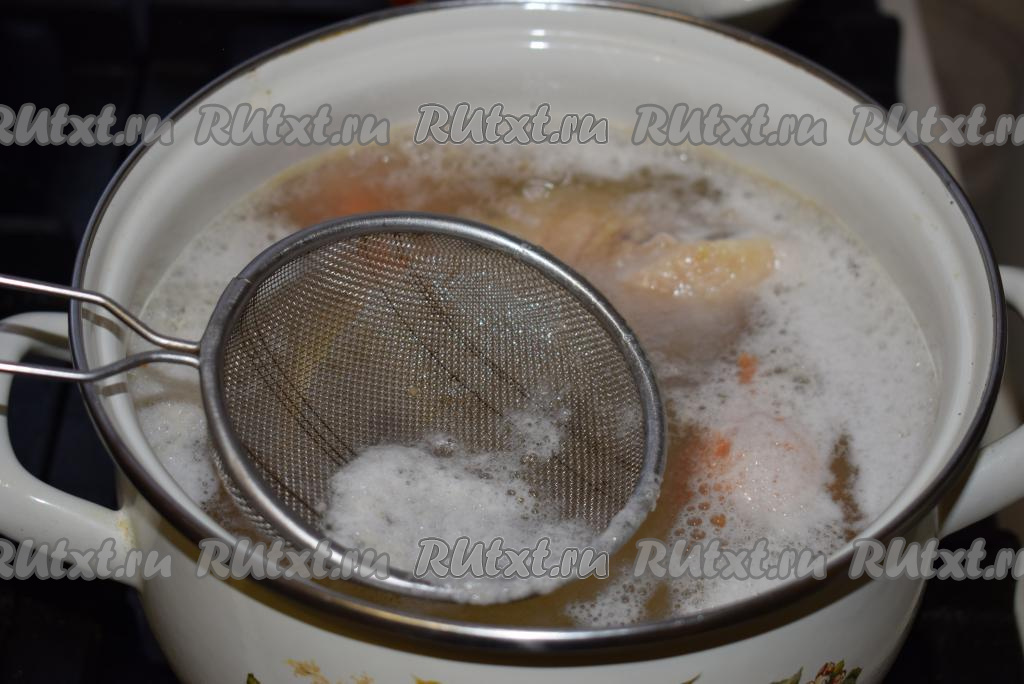 Дадим воде закипеть и снимаем пену при помощи шумовки (или ситечка). Когда пена снята, делаем огонь средним и продолжаем варить наш куриный бульон, примерно, 30-35 минут (до готовности мяса).