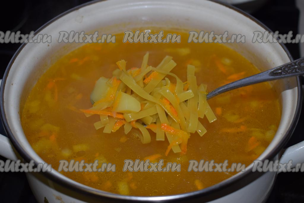 Лапшу ломаем на небольшие кусочки и добавляем в куриный суп с картофелем.