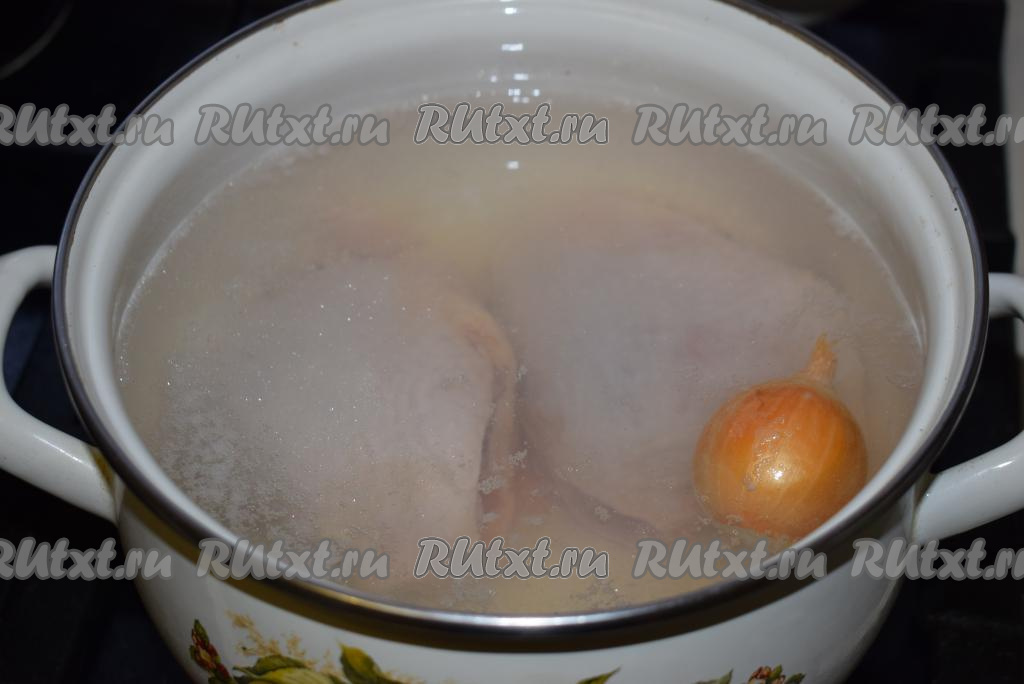 Куриные бедра (или другие части курицы) промываем холодной водой и обсушиваем бумажными полотенцами. В кастрюлю наливаем воду, кладём бедра, целую промытую не очищенную луковицу и кусочек очищенной моркови, отправляем на огонь. Овощи нужны для цвета и аромата бульона.