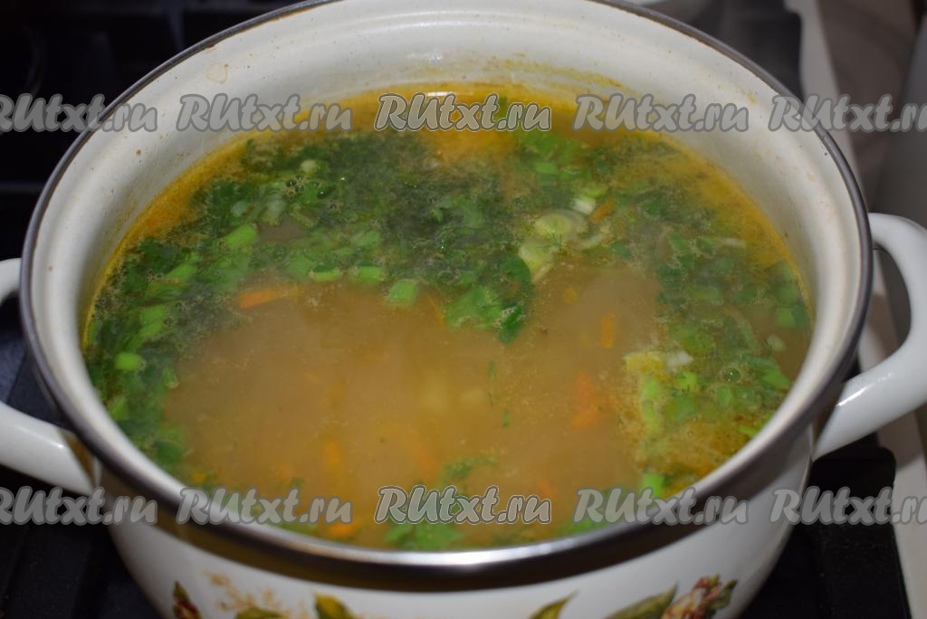 Далее к готовому супу добавляем мелко нарезанную зелень, даем ему закипеть и выключаем огонь.