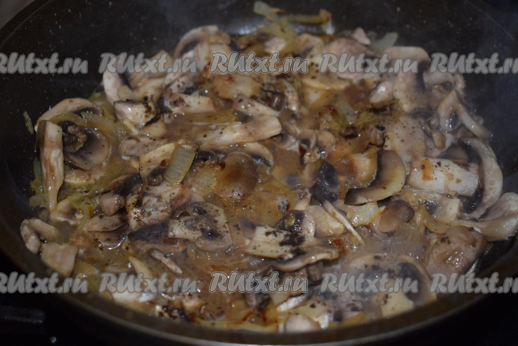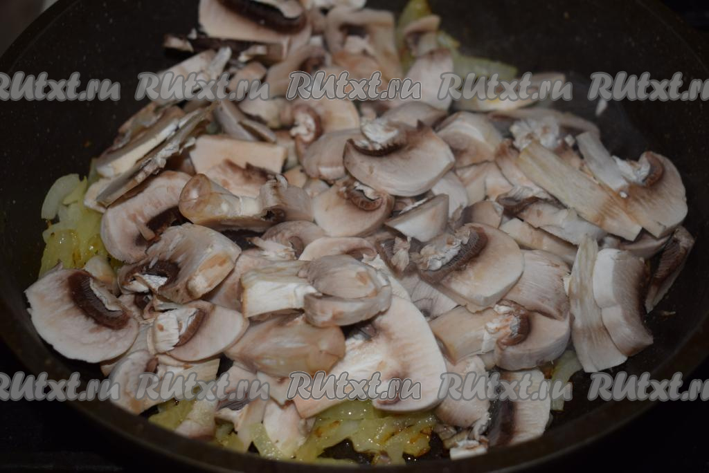 Добавить к луку шампиньоны, нарезанные на пластины (или крупные кусочки), накрыть содержимое сковороды крышкой.