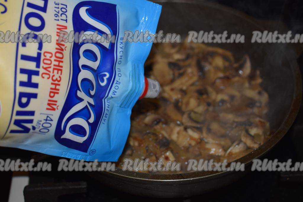 К грибам добавить постный майонез, перемешать, потушить шампиньоны с луком и майонезом на медленном огне, примерно, 2-3 минуты и выключить огонь.
