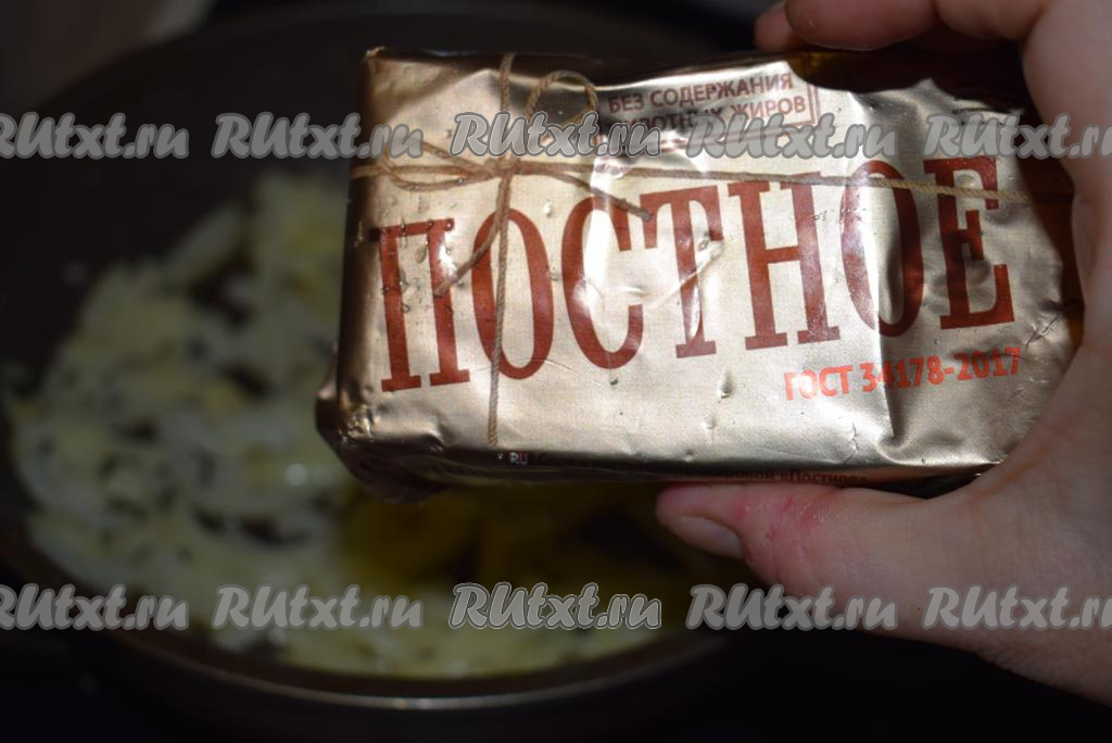Сковороду разогреть на медленном огне, добавить растительный спред (масло, которое по виду напоминает сливочное, но состоит из растительных компонентов) и выложить лук.