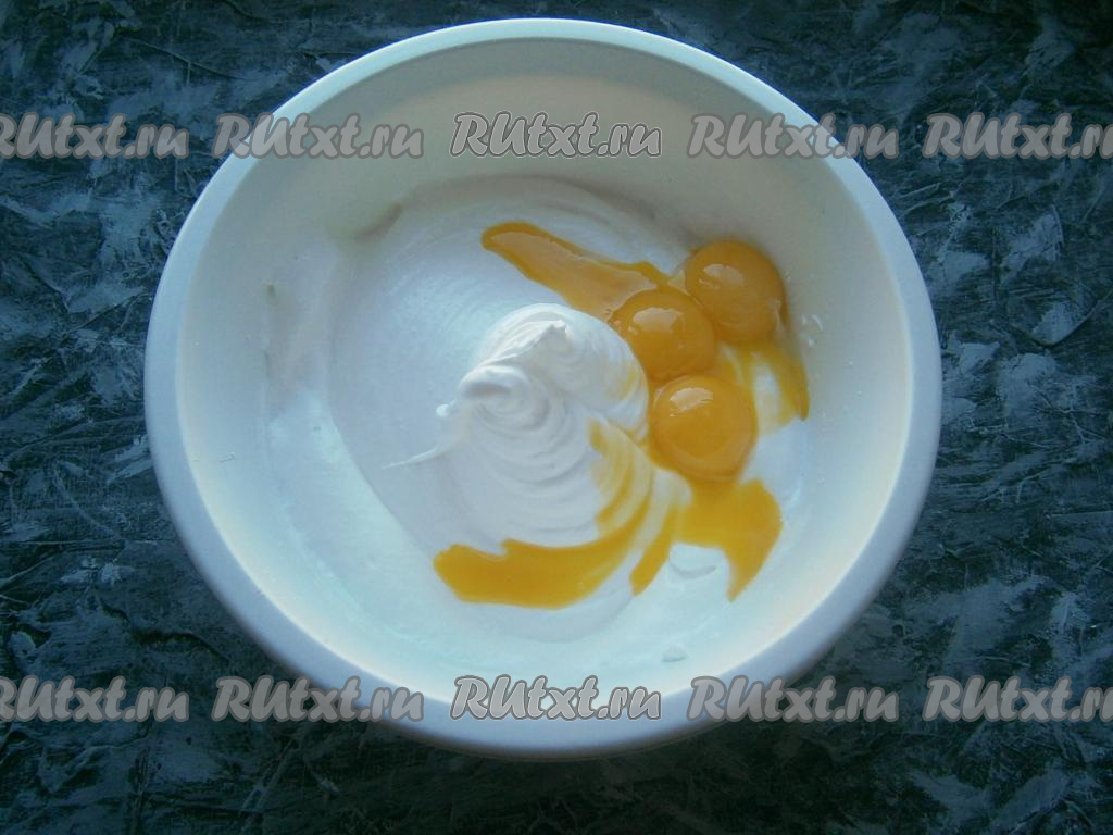 Добавить желтки, взбить миксером в течение несколько секунд (до однородности массы).