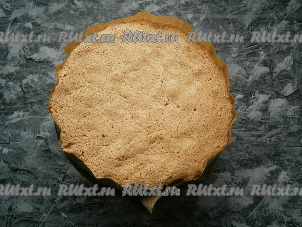 Духовку заранее разогреть до 180 градусов. Отправить в нее форму с тестом. Выпекать бисквит около 35-40 минут, не открывая духовку первые 20-25 минут. Дать бисквиту немного остыть в форме.