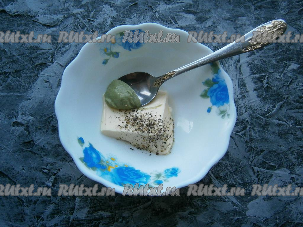 К размягченному сливочному маслу добавить горчицу и черный свежемолотый перец.