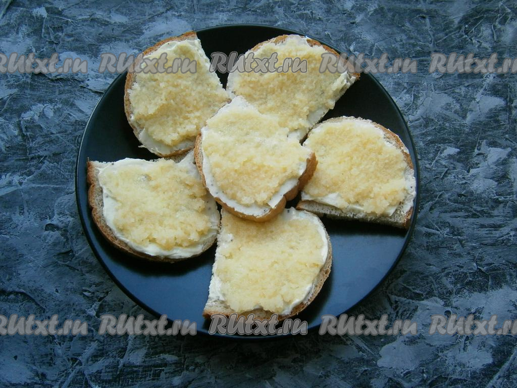 Сверху каждый бутерброд смазать 1 чайной ложкой икры мойвы.