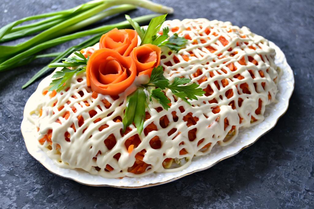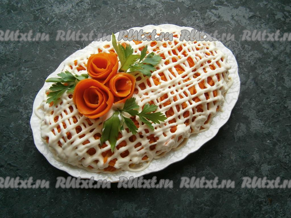 Морковь чуть посолить и нанести сверху густую сетку из майонеза. Слоеный салат украсить розочками из моркови и зеленью.