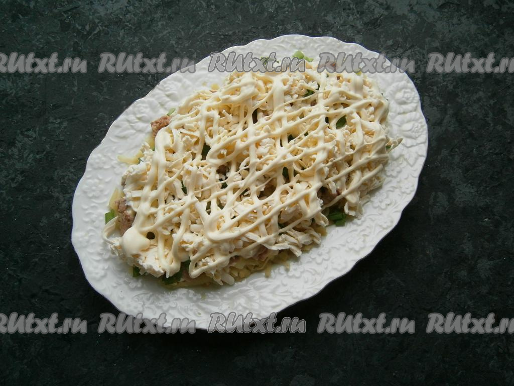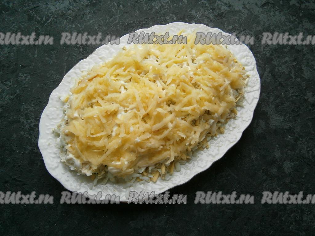 Следующим слоем выложить плавленный сыр, натертый на крупной терке, нанести сеточку из майонеза.