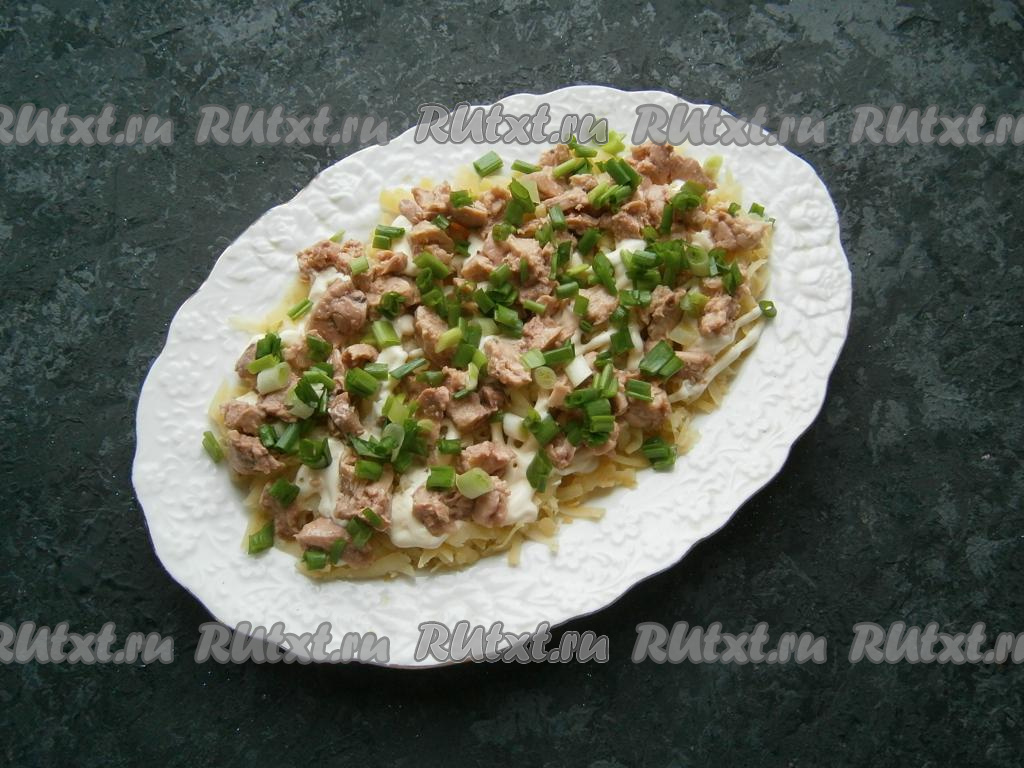 Измельчить печень трески и выложить её поверх картошки. Посыпать слой печени измельченным зеленым луком.