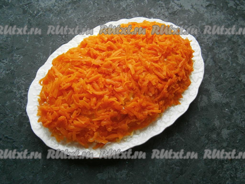 Слой яблок немного смазать майонезом и выложить далее слой натертой вареной моркови.