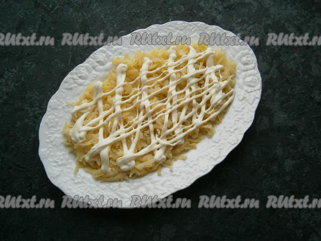 Вареные картошку, морковь и яйца очистить. Картофель натереть на крупной терке и выложить первым слоем на блюдо (или в салатник). Картошку немного посолить, нанести сеточку из майонеза.