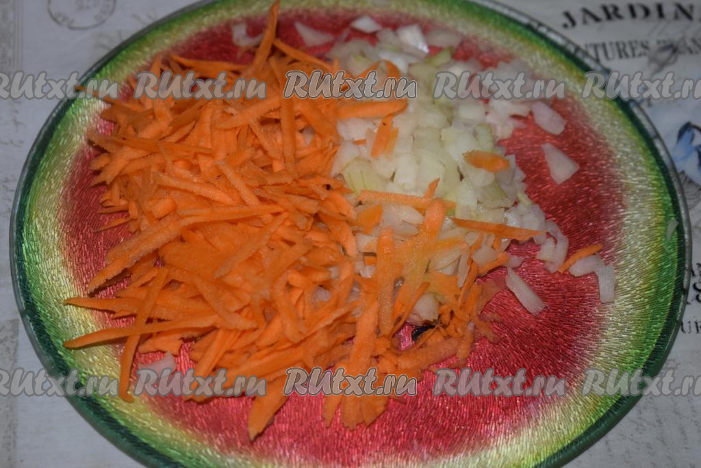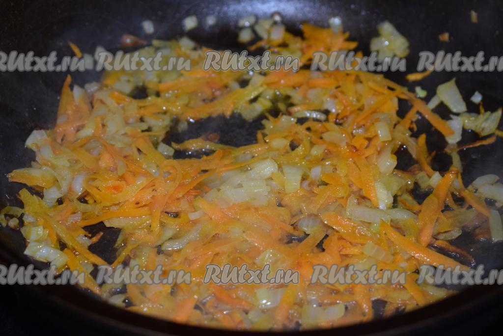 В сковороде разогреем растительное масло и обжарим лук с морковью на медленном огне до прозрачности (в течение 8-10 минут), не забывая периодически помешивать. В конце обжаривания наливаем в сковороду 2 столовые ложки воды, даём овощам протушиться на небольшом огне несколько минут и выключаем огонь.