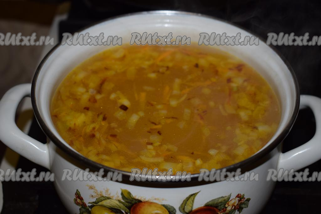 Далее, к практически готовому картофелю, выкладываем лук с морковью со сковороды и доводим суп до кипения.
