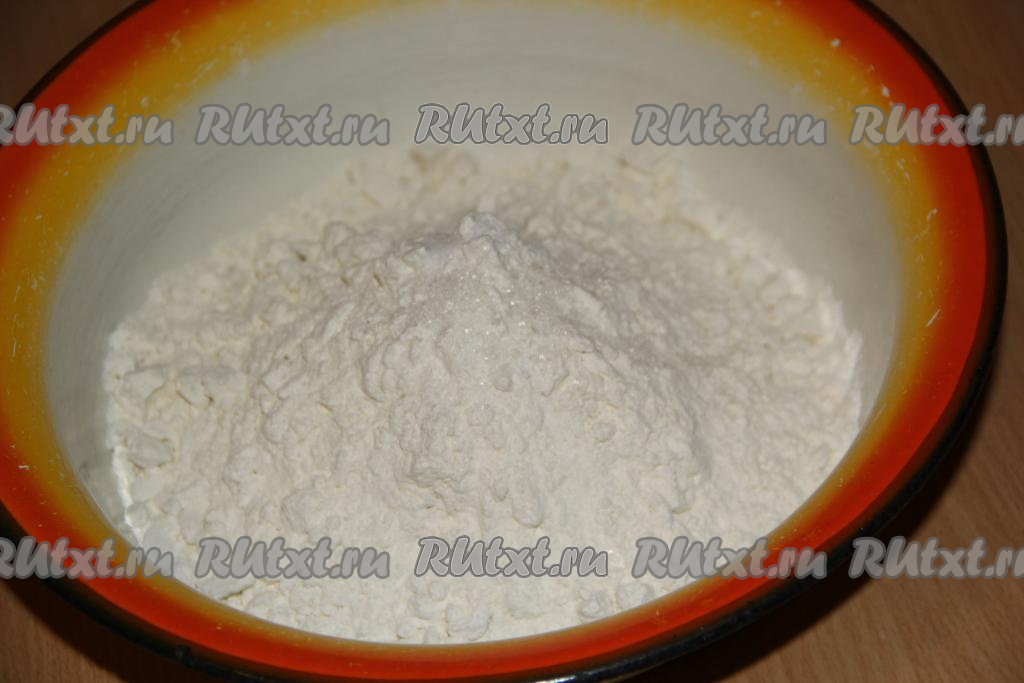 В глубокую миску всыпать 500 грамм муки, добавить соль и сахар.