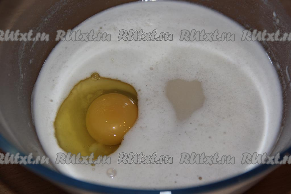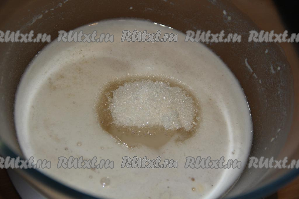 Дрожжи "оживут" и запузырятся. Добавить в дрожжевую массу растительное масло и оставшийся сахар, перемешать.