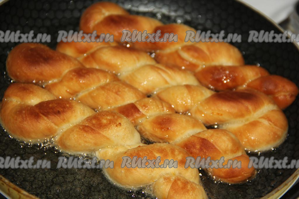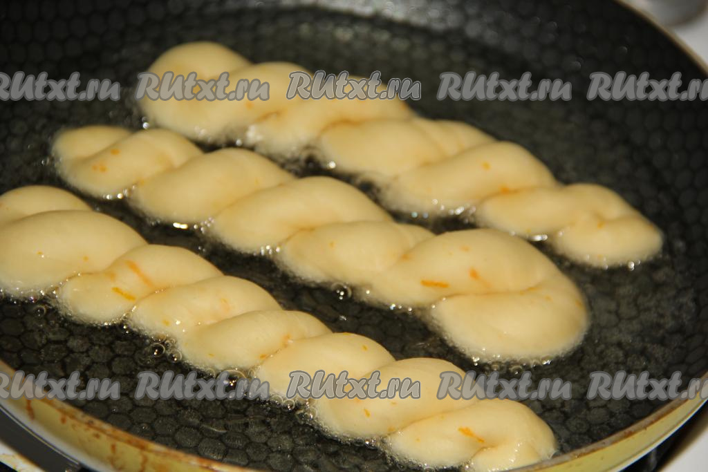 Жарить витые пончики на среднем огне до золотистого цвета с двух сторон (я переворачивала пончики с помощью щипцов).