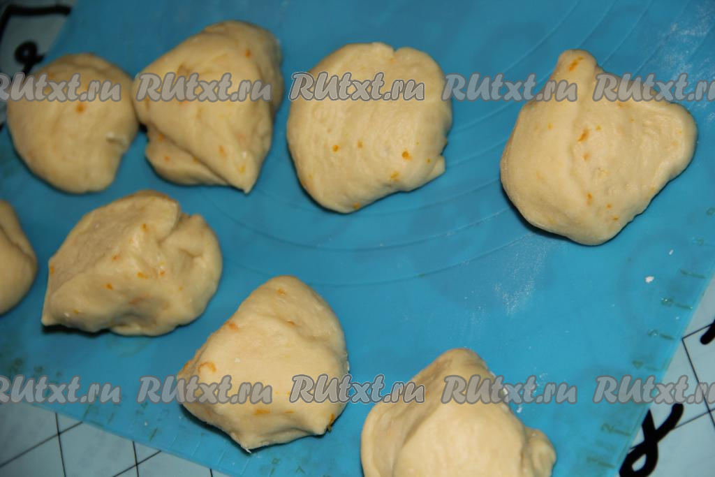 Готовое дрожжевое тесто обмять и разделить на части. Из такого теста можно сделать пончики любой формы. Я решила сделать "витые" пончики (в форме спиралек), они выглядят необычно и эффектно. Для формирования таких пончиков я разделила тесто на 16 частей.