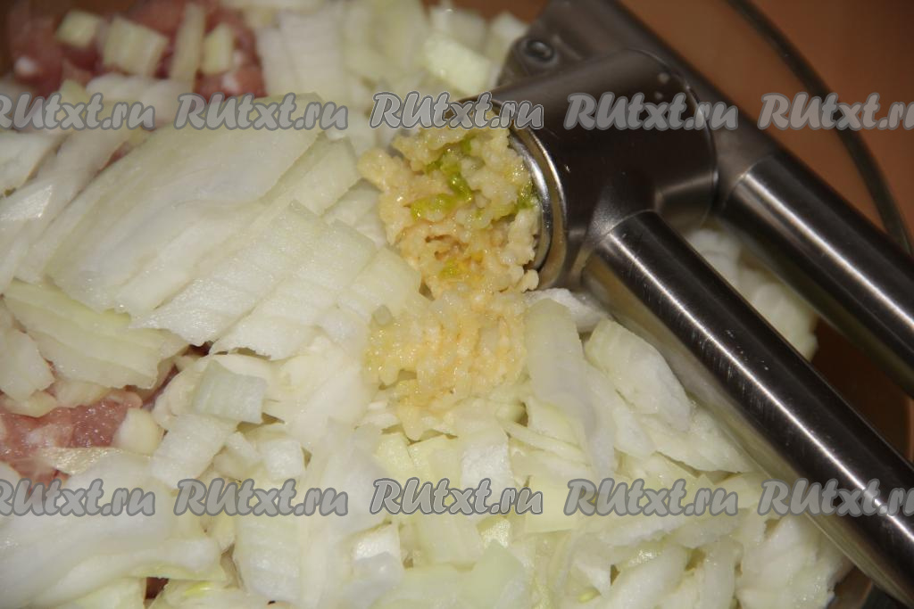 Пропустить очищенный чеснок через пресс и выложить к фаршу с луком.