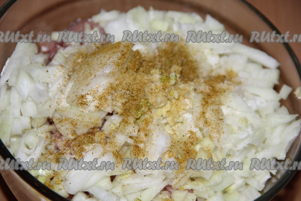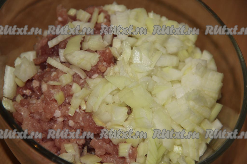 Очищенный и мелко нарезанный лук добавить к мясному фаршу.