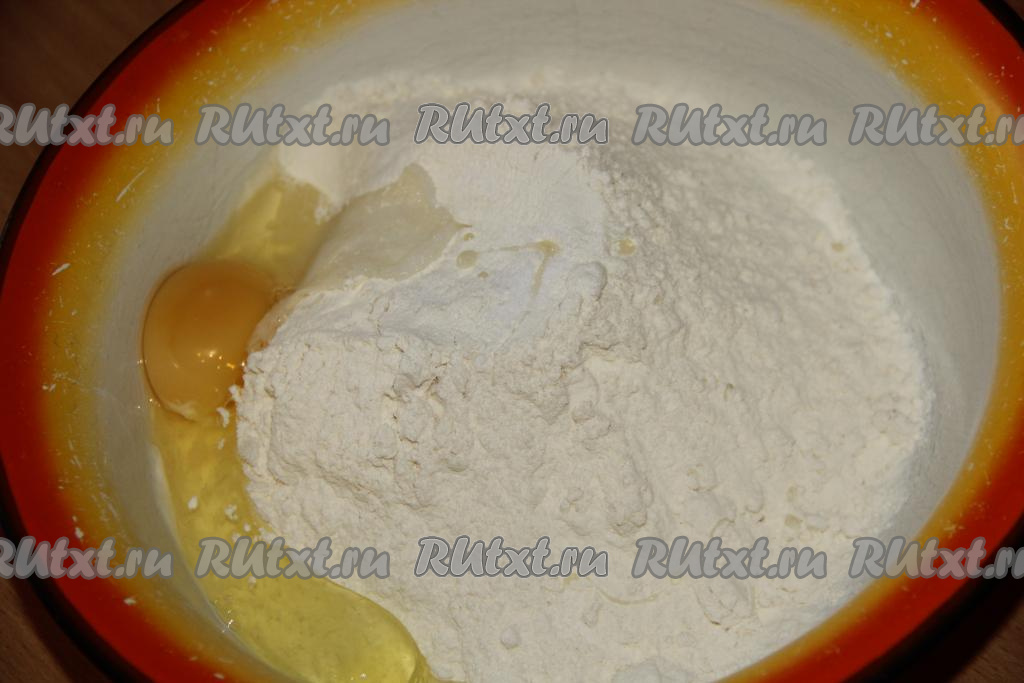 Для начала приготовим тесто, для этого в миску нужно всыпать муку и соль, добавить яйцо.