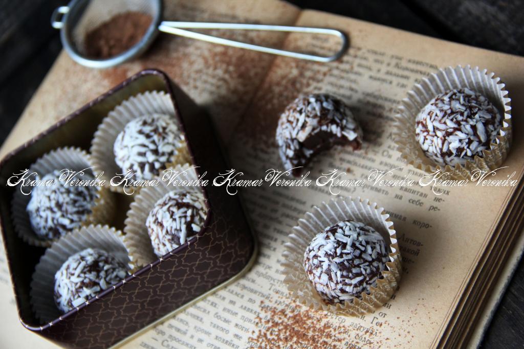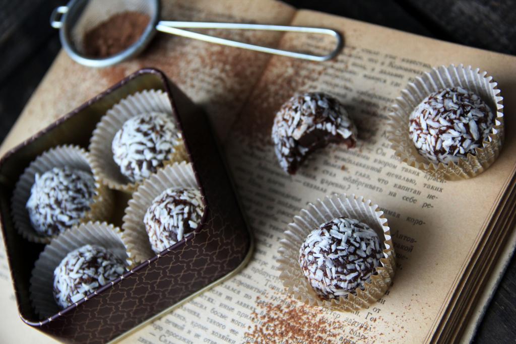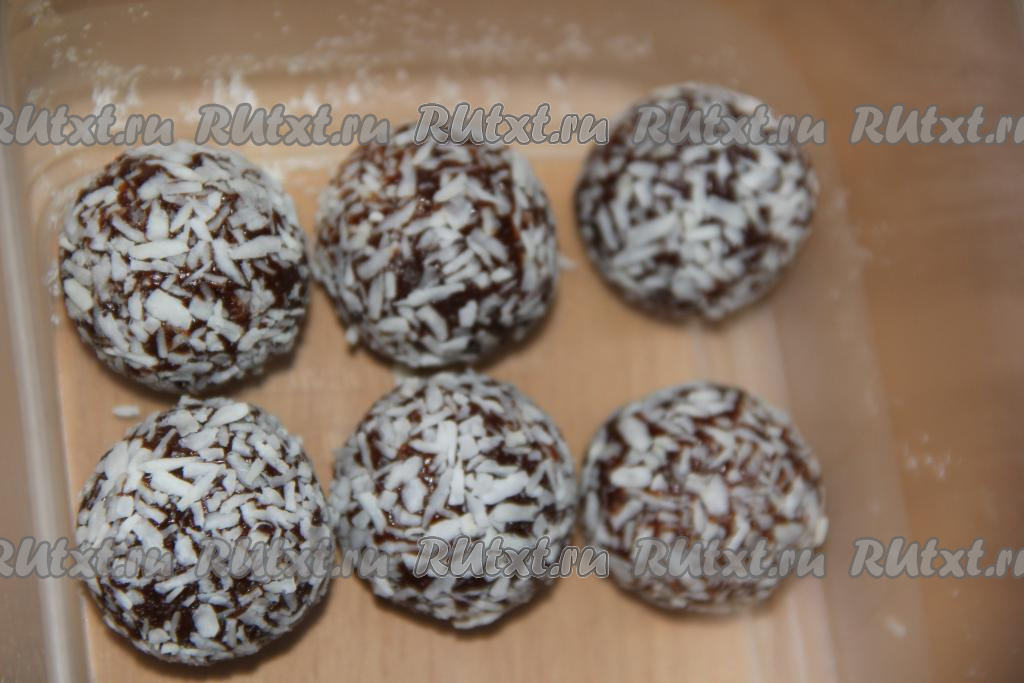 Обвалять конфетки в кокосовой стружке, выложить в лоток, накрыть крышкой и убрать в холодильник на час. Из этого количества ингредиентов получается 12-13 конфет размером с грецкий орех.